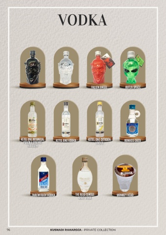 VODKA FALLEN ANGEL OUTER SPACE KETEL ONE BOTANICAL KETEL ONE VODKA KETEL ONE CITROEN ROMIOS OUZO PEACH & ORANGE VODKA BLOSSOM ZAREWITSCH VODKA THE REID SINGLE MONKEY HEAD MALT VOKA 76 KUSNADI RAHARDJA - PRIVATE COLLECTION