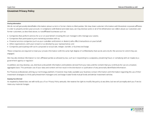 We do not sell personally identifiable information about current or former clients to third parties. We may share customer information with Envestnet corporate affiliates