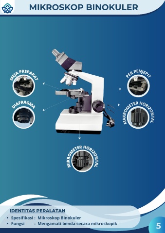MIKROSKOP BINOKULER PER PENJEPIT MEJA PREPARAT DIAFRAGMA MAKROMETER HORIZONTAL IDENTITAS PERALATAN MIKROMETER HORIZONTAL Spesifikasi : Mikroskop Binokuler Fungsi : Mengamati benda secara mikroskopik 5