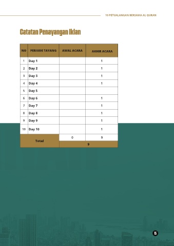 10 PETUALANGAN BERSAMA AL QURAN Catatan Penayangan Iklan NO PERIODE TAYANG AWAL ACARA AKHIR ACARA 1 Day 1 1 2 Day 2 1 3 Day 3 1 4 Day 4 1 5 Day 5 6 Day 6 1 7 Day 7 1 8 Day 8 1 9 Day 9 1 10 Day 10 1 0 9 Total 9 15 15