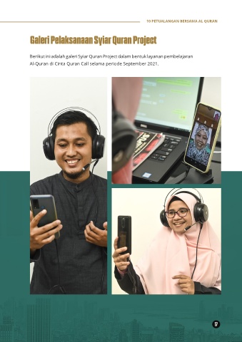 10 PETUALANGAN BERSAMA AL QURAN Galeri Pelaksanaan Syiar Quran Project Berikut ini adalah galeri Syiar Quran Project dalam bentuk layanan pembelajaran Al-Quran di Cinta Quran Call selama periode September 2021. 17 17