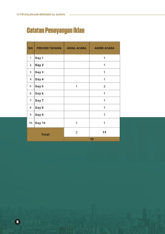 10 PETUALANGAN BERSAMA AL QURAN Catatan Penayangan Iklan NO PERIODE TAYANG AWAL ACARA AKHIR ACARA 1 Day 1 1 2 Day 2 1 3 Day 3 1 4 Day 4 1 5 Day 5 1 2 6 Day 6 1 7 Day 7 1 8 Day 8 1 9 Day 9 1 10 Day 10 1 1 2 11 Total 13 16 16