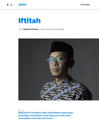 6 ∞ I FTITAH Iftitah Oleh: Hadi Azis Pratama | Ketua Cinta Quran Foundation “ Cinta Quran Foundation selalu berkomitmen meneruskan perjuangan mewujudkan mimpi agung nan mulia, yakni mewujudkan Indonesia Cinta Quran.