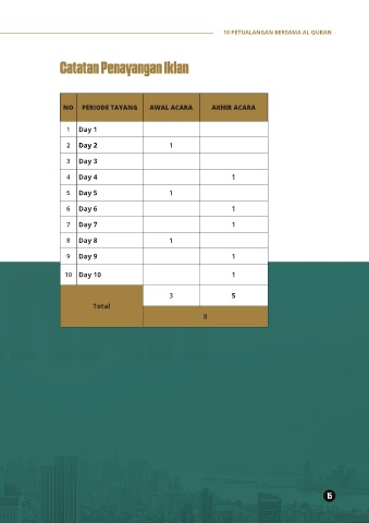 10 PETUALANGAN BERSAMA AL QURAN Catatan Penayangan Iklan NO PERIODE TAYANG AWAL ACARA AKHIR ACARA 1 Day 1 2 Day 2 1 3 Day 3 4 Day 4 1 5 Day 5 1 6 Day 6 1 7 Day 7 1 8 Day 8 1 9 Day 9 1 10 Day 10 1 3 5 Total 8 15 15