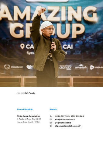 Foto oleh: Sigit Prasetio Alamat Redaksi: Kontak: Cinta Quran Foundation (0251) 8571762 / 08111 959 005 Jl. Parikesit Raya No. 35-37, info@cintaquran.or.id Bogor, Jawa Barat - 16153 @cqfoundationid https://cqfoundation.or.id/