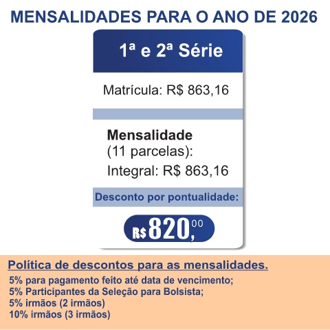 MENSALIDADES PARA O ANO DE 2026 1ª e 2ª Série Matrícula: R$ 863,16 Mensalidade (11 parcelas): Integral: R$ 863,16 Desconto por pontualidade: 820, 00 Política de descontos para as mensalidades.