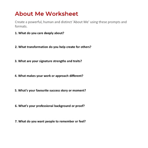 Create a powerful, human and distinct 'About Me' using these prompts and