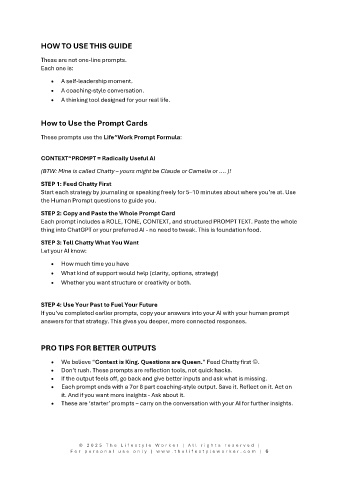 · Each prompt ends with a 7or 8 part coaching-style output. Save it. Reflect on it. Act on