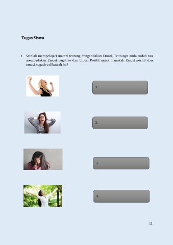 Tugas Siswa 1. Setelah mempelajari materi tentang Pengendalian Emosi, Tentunya anda sudah tau membedakan Emosi negative dan Emosi Positif maka manakah Emosi positif dan emosi negative dibawah ini? 1. 2. 3. 4. 12