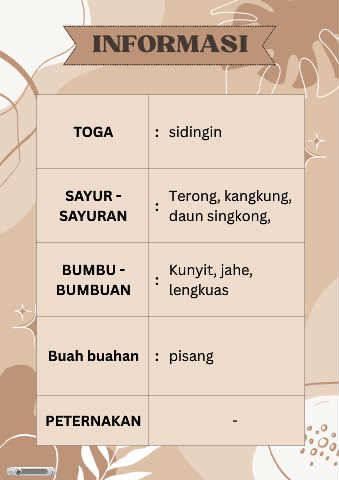 INFORMASI TOGA : sidingin SAYUR - Terong, kangkung, SAYURAN : daun singkong, BUMBU - Kunyit, jahe, BUMBUAN : lengkuas Buah buahan : pisang PETERNAKAN -