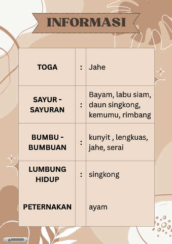 INFORMASI TOGA : Jahe Bayam, labu siam, SAYUR - SAYURAN : daun singkong, kemumu, rimbang BUMBU - kunyit , lengkuas, BUMBUAN : jahe, serai LUMBUNG : singkong HIDUP PETERNAKAN ayam
