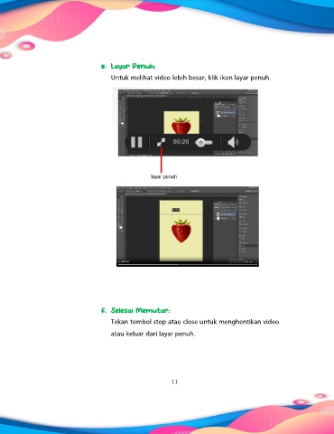 e. Layar Penuh: Untuk melihat video lebih besar, klik ikon layar penuh. f. Selesai Memutar: Tekan tombol stop atau close untuk menghentikan video atau keluar dari layar penuh. 11