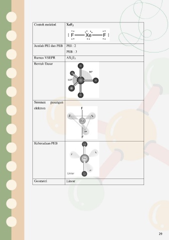 Contoh molekul XeF 2 Jumlah PEI dan PEB PEI : 2 PEB : 3 Rumus VSEPR AX 2E 3 Bentuk Dasar Susunan pasangan elektron Keberadaan PEB Geometri Linear 29