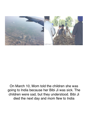 On March 10, Mom told the children she was going to India because her Bibi Ji was sick. The children were sad, but they understood. Bibi Ji died the next day and mom flew to India