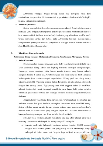 Arthropoda dibagi menjadi 4 kelas yaitu Crustacea, Arachnoidea, Myriapoda, Insecta