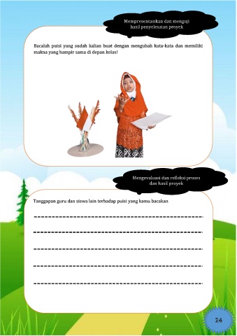 Bacalah puisi yang sudah kalian buat dengan mengubah kata-kata dan memiliki