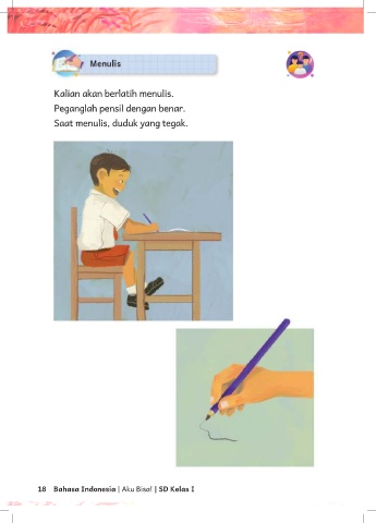 Kalian akan berlatih menulis. Peganglah pensil dengan benar. Saat menulis, duduk yang tegak. 18 Bahasa Indonesia | Aku Bisa! | SD Kelas I