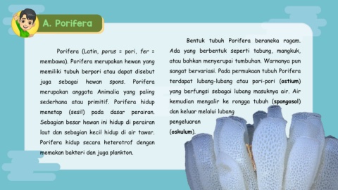 Porifera (Latin, porus = pori, fer = Ada yang berbentuk seperti tabung, mangkuk,