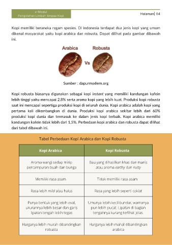 kandungan kafein tidak lebih dari 1,5%. Perbedaan kopi arabica dan robusta dapat dilihat