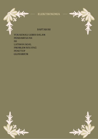ELEKTROKIMIA DAFTAR ISI YUK KENALI LEBIH DALAM PENDAHULUAN ISI LATIHAN SOAL PROBLEM SOLVING PENUTUP GLOSARIUM