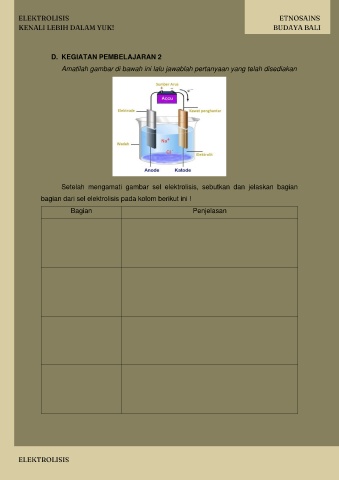 D. KEGIATAN PEMBELAJARAN 2 Amatilah gambar di bawah ini lalu jawablah pertanyaan yang telah disediakan Setelah mengamati gambar sel elektrolisis, sebutkan dan jelaskan bagian bagian dari sel elektrolisis pada kolom berikut ini ! Bagian Penjelasan