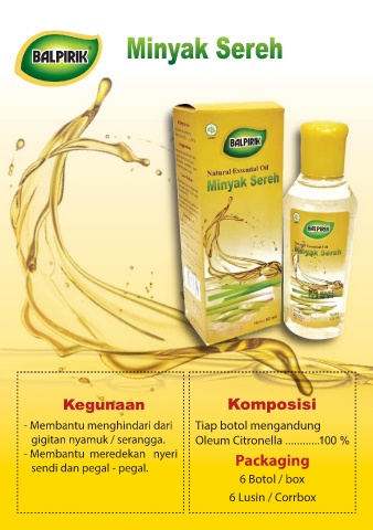 - Membantu menghindari dari Tiap botol mengandung gigitan nyamuk / serangga. Oleum Citronella - Membantu meredekan nyeri Packaging sendi dan pegal - pegal. 6 Botol / box 6 Lusin / Corrbox