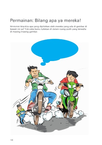 Permainan: Bilang apa ya mereka! Hmmmm kira-kira apa yang dipikirkan oleh mereka yang ada di gambar di bawah ini ya? Yuk coba kamu tuliskan di dalam ruang putih yang tersedia di masing-masing gambar. 130