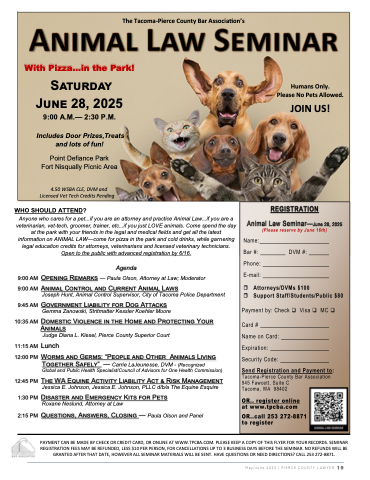 information on ANIMAL LAW—come for pizza in the park and cold drinks, while garnering