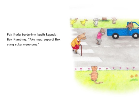 Pak Kuda berterima kasih kepada Bok Kambing. "Aku mau seperti Bok yang suka menolong."