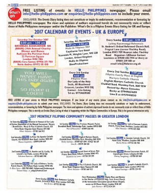 those of Hello Philippines newspaper and/or the Publisher. What’s On is a Filipino Events Diary listing for UK and Europe.
