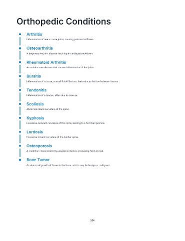 Orthopedic Arthritis Inflammation , . Osteoarthritis A . Rheumatoid An . Bursitis Inflammation , -filled Tendonitis Inflammation , . Scoliosis Abnormal . Kyphosis Excessive , . Lordosis Excessive . Osteoporosis A , . Bone An , 204