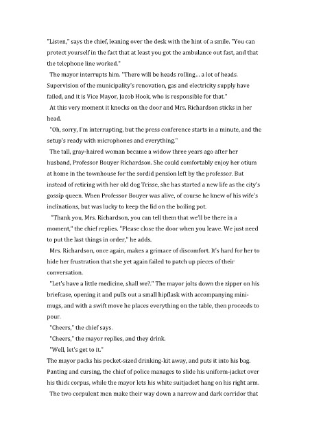"Cheers," the mayor replies, and they drink.
