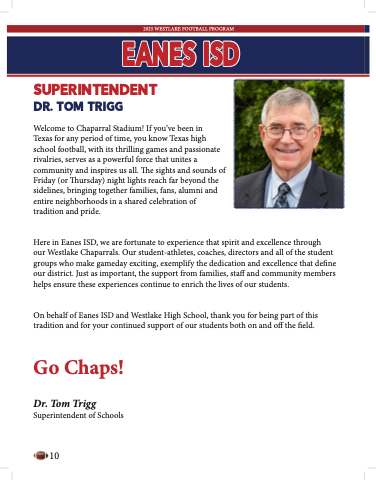 On behalf of Eanes ISD and Westlake High School, thank you for being part of this