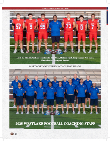 2025 WESTLAKE FOOTBALL PROGRAM LEFT TO RIGHT: William Twardowski, Rees Wise, Maddox Flynt, Tony Salazar, Will Hesse, Mason Lastor, Thompson Bennett VARSITY CAPTAINS WITH HEAD COACH TONY SALAZAR 2025 WESTLAKE FOOTBALL COACHING STAFF 46