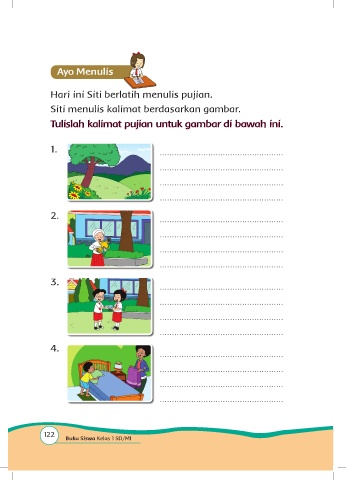 Ayo Menulis Hari ini Siti berlatih menulis pujian. Siti menulis kalimat berdasarkan gambar. Tulislah kalimat pujian untuk gambar di bawah ini. 1. 2. 3. 4. 122 Buku Siswa Kelas 1 SD/MI