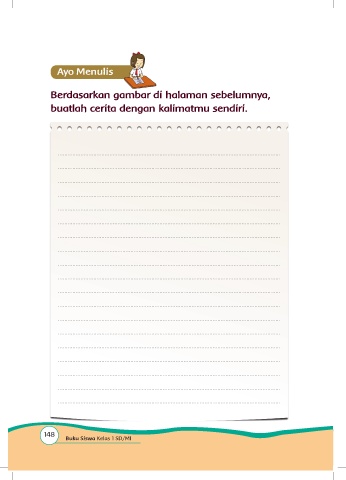 Ayo Menulis Berdasarkan gambar di halaman sebelumnya, buatlah cerita dengan kalimatmu sendiri. 148 Buku Siswa Kelas 1 SD/MI