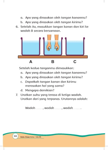7. Urutkan suhu yang terasa di ketiga wadah.