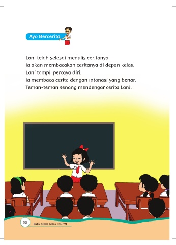 Ayo Berceritaa Lani telah selesai menulis ceritanya. Ia akan membacakan ceritanya di depan kelas. Lani tampil percaya diri. Ia membaca cerita dengan intonasi yang benar. Teman-teman senang mendengar cerita Lani. 50 Buku Siswa Kelas 1 SD/MI