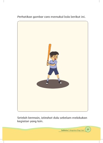 Perhatikan gambar cara memukul bola berikut ini. Setelah bermain, istirahat dulu sebelum melakukan kegiatan yang lain. 27 Subtema 1: Kegiatan Pagi Hari