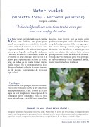 Water violet, ou violette d’eau, est, comme son nom l’indique, une plante gour- mande en eau qui trouve ses habitats de prédi- lection en bord de ruisseau ou de fossés, dans les prairies humides et les milieux marécageux, raison pour laquelle on l’appelle également « hottonie des marais ». Semblables à celles de la violette, ses fleurs délicates, entre le rose et le mauve pâle, s’épanouissent au bout de petites tiges, au milieu de la rosette formée par les feuilles rondes. En se propageant grâce à ses rhizomes, la plante colonise de vastes étendues où elle dessine, au printemps, de ravissants tapis colorés.