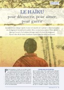 pression minimaliste renferme un pouvoir guéris- seur. Le haïku est une clé de vie qui ouvre facilement les portes intérieures, libère le trop-plein du passé et donne de l’espace au bonheur d’exister en le présent instant. Le phénomène le plus surprenant est que cette parenthèse offerte par le haïku réussit le prodige de suspendre le temps. De plus en plus pressantes, les activités quotidiennes donnent rarement l’occasion de reprendre correctement son souffle, là est la particula- rité de cette formulation.