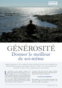 sourire qui donne confiance, un geste de soutien spon- tané et joyeux, un mot qui va au-devant du besoin de l’autre, c’est une communication authentique qui se livre sans jamais exiger de compensation en retour. Nous avons tous au fond de nous cette graine d’amour sincère qui porte le nom de générosité.