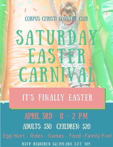 SATURDAY EASTER Corpus Christi Country Club CARNIVAL I T ' S F I N A L L Y E A S T E R April 3rd · 11 - 2 p.m. Adults: $30 children: $20 Egg Hunt · Rides · Games · Food ·· Family Fun! R S V P R e q u i r e d 3 6 1 . 9 9 1 . 2 8 1 1 e x t . 1 0 9