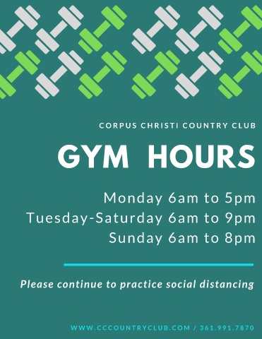 C O R P U S C H R I S T I C O U N T R Y C L U B GYM HOURS Monday 6am to 5pm Tuesday-Saturday 6am to 9pm Sunday 6am to 8pm Please continue to practice social distancing W W W . C C C O U N T R Y C L U B . C O M / 3 6 1 . 9 9 1 . 7 8 7 0