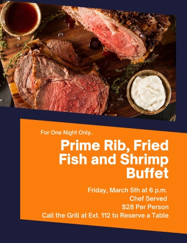 Prime Rib, Fried Fish and Shrimp For One Night Only.. Buffet Friday, March 5th at 6 p.m. Chef Served $28 Per Person Call the Grill at Ext. 112 to Reserve a Table