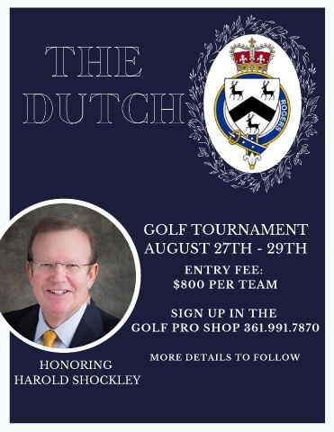 The Dutch GOLF TOURNAMENT AUGUST 27TH - 29TH ENTRY FEE: $800 PER TEAM SIGN UP IN THE GOLF PRO SHOP 361.991.7870 HONORING MORE DETAILS TO FOLLOW HAROLD SHOCKLEY