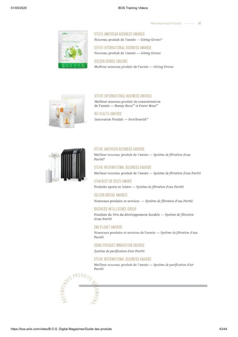 01/05/2020 BOS Training Videos https://bos.ariix.com/video/B.O.S. Digital Magazines/Guide des produits 43/44