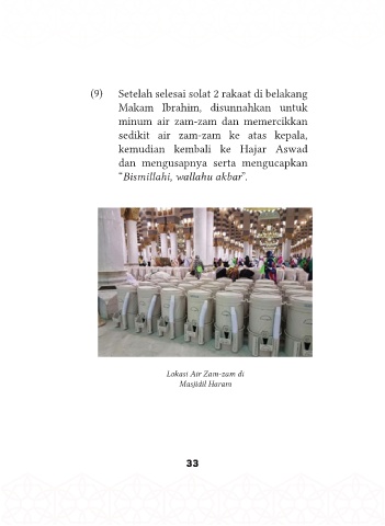 (9) Setelah selesai solat 2 rakaat di belakang Makam Ibrahim, disunnahkan untuk minum air zam-zam dan memercikkan sedikit air zam-zam ke atas kepala, kemudian kembali ke Hajar Aswad dan mengusapnya serta mengucapkan “ ”. 33