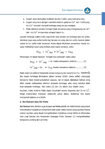 b. Logam seng larut dengan memberi elektron pada ion Cu dari CuSO4(aq),