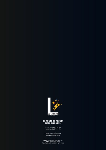 29 Route De ReuIllY 36100 ISSouDuN +33 (0)2 54 03 18 49 +33 (0)6 70 78 92 72 lumifete@lumifete.com www.lumifete.com rcs ChateaurouX b 349880 963 sIret 349 880 963 00021 tVa fr 8134988096300021 - ape 2740Z